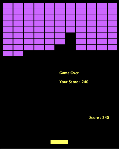 - 概要:ランダムな場所に現れる玉たちを跳ね返し、ブロックを崩して得点を稼ぐ