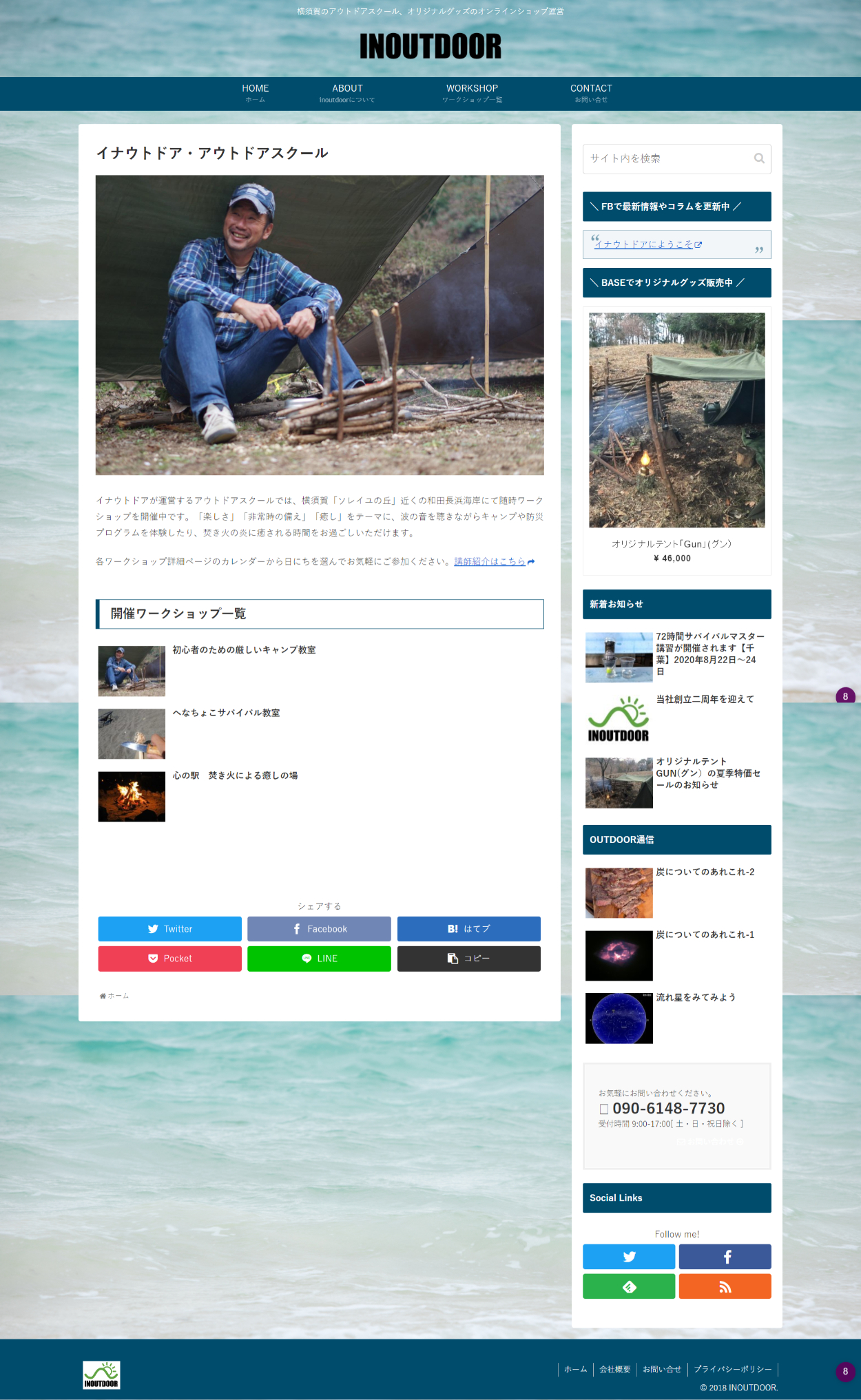 アウトドアスクール様のWEBサイト作成 橘 敦子 災害対策インストラクター OVERVIEW 横須賀でアウトドアスクールやオリジナルグッズ販売を行うイナウトドア様のHPを作成しました。 YEAR 2019 ・Wordpress・打ち合わせの上、無料テンプレート「Cocoon」を利用・各ワークショップのライティング・講師紹介のライティング・予約フォーム作成・お問合せフォーム作成 etc. WEBSITE