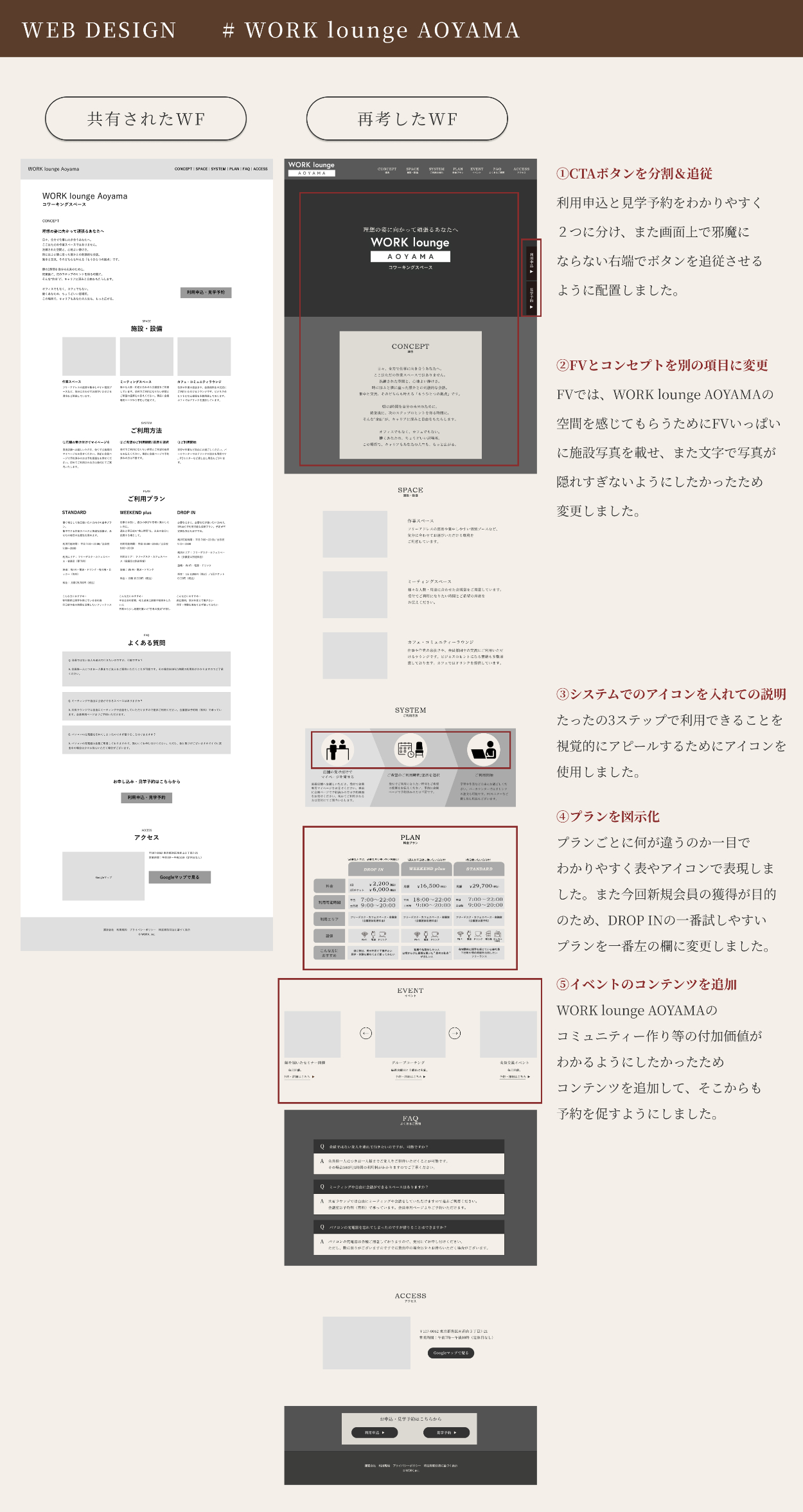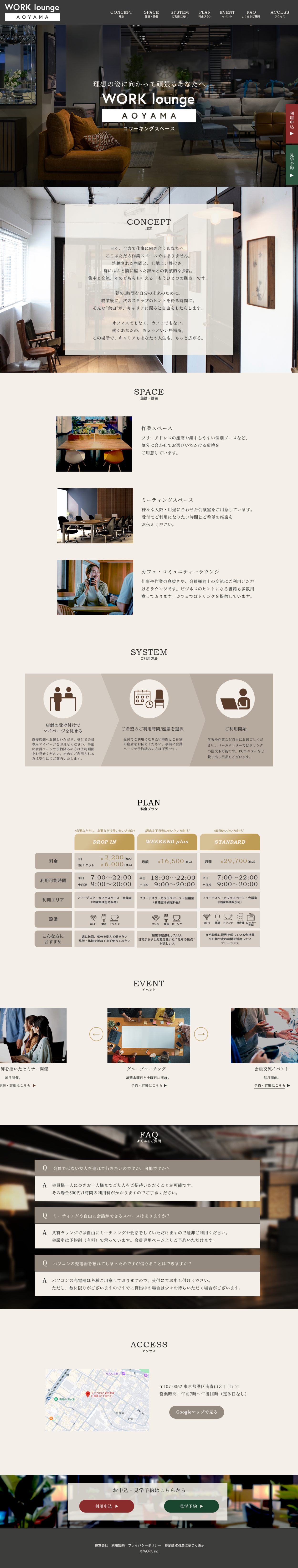 洗練された世界観を感じてもらえるようなフォントや写真選びを行い、また上品でかつ無駄がないような丁度良い余白を意識して制作しました。コワーキングスペースのサイトだけでなく、高級感のある日用品やインテリアのサイトを沢山見ながら、構成方法を学び、実際にWORK lounge AOYAMAの空間を感じてもらえるように沢山の写真を配置しました。