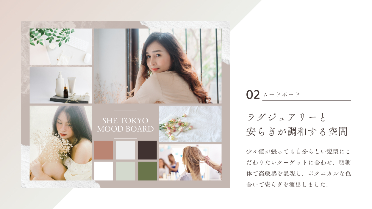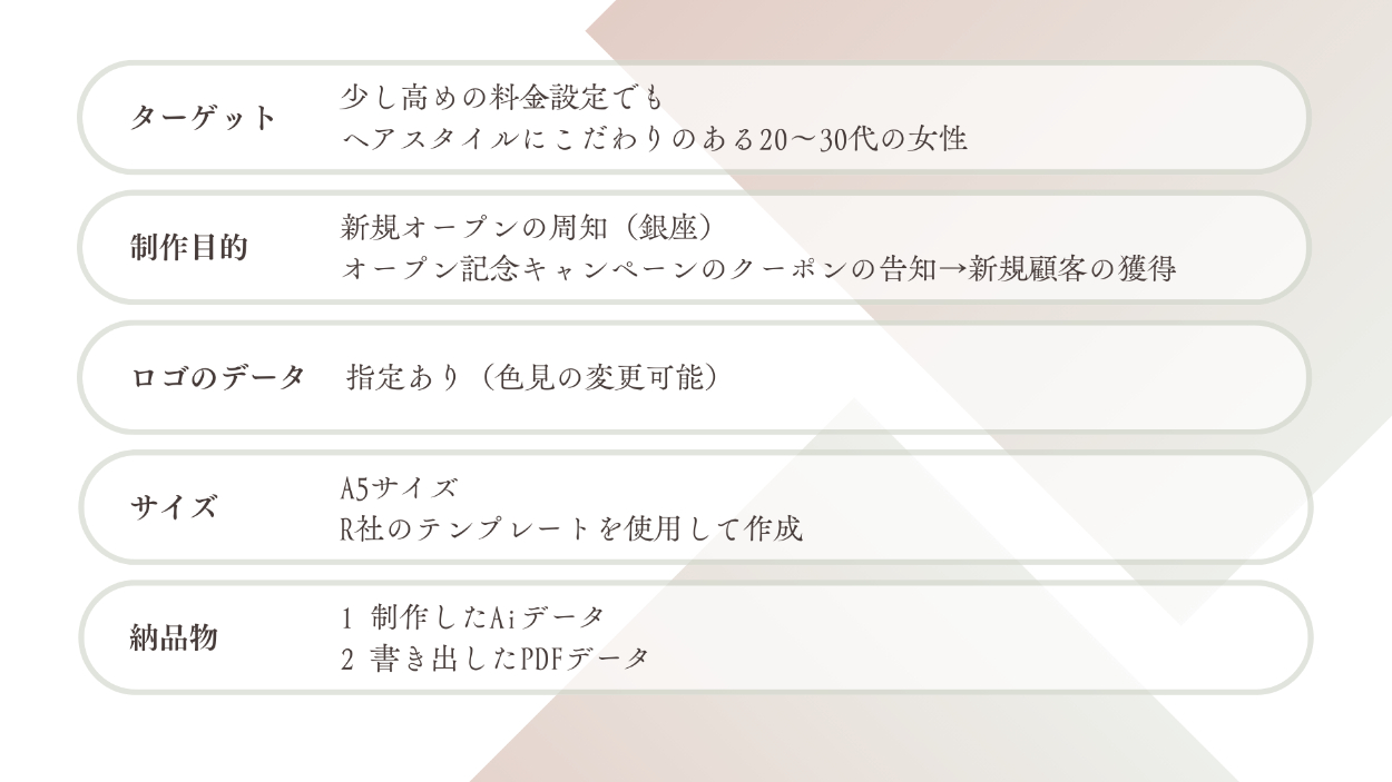 クライアントから事前にいただいた資料の中にピンクや緑のパステル調のフライヤーが多かったこと、立地が銀座でターゲットが少々割高でも納得した髪型にしたい女性だったことから、高級感と専属美容師の専門性が伝わるような、パステル調と明朝体をメインにしたトーン&マナーを設定した。