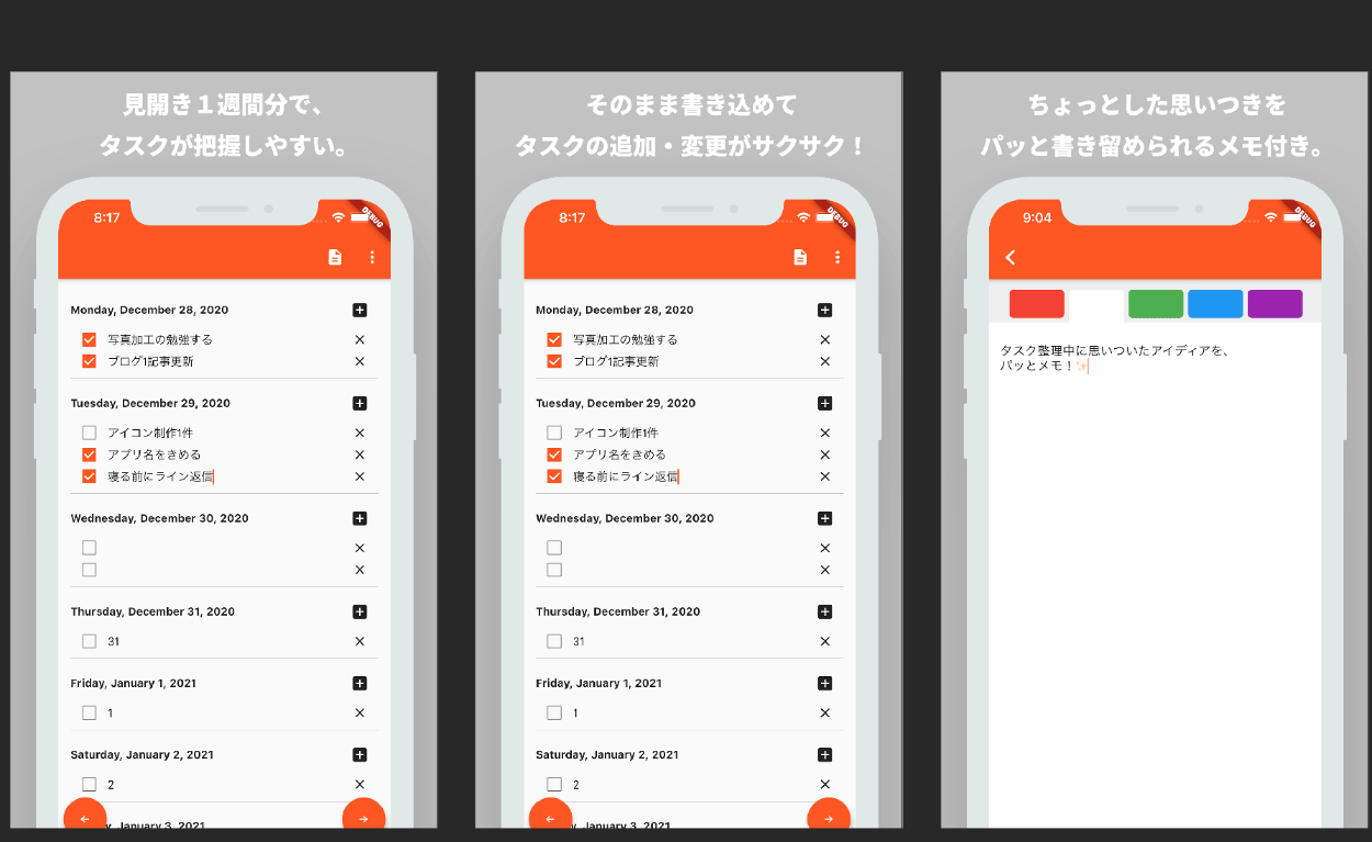 ・目標までどんなタスクにしようか考えている時に、アイディアが湧くこともあるので、1タップでメモ画面を呼び出せるようにしています。
