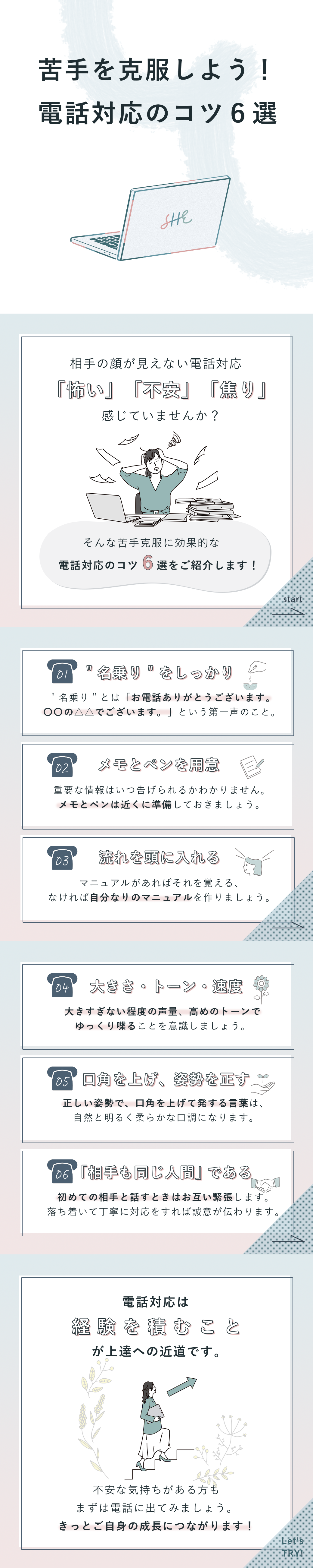 ◯「電話対応」が苦手と感じるかたに共感してもらえるよう、苦手と思う理由の理解、それら解決を簡単に取り組める方法をわかりやすく組み立てました。