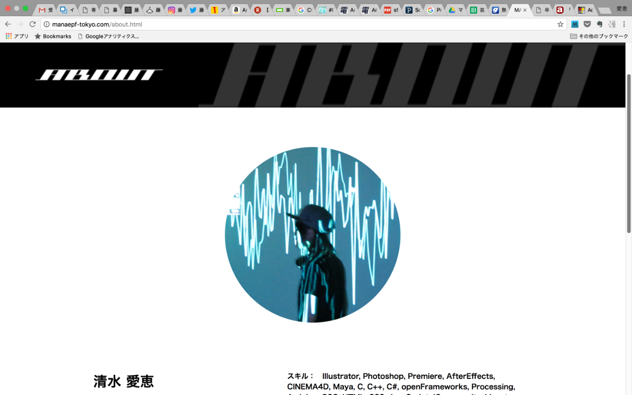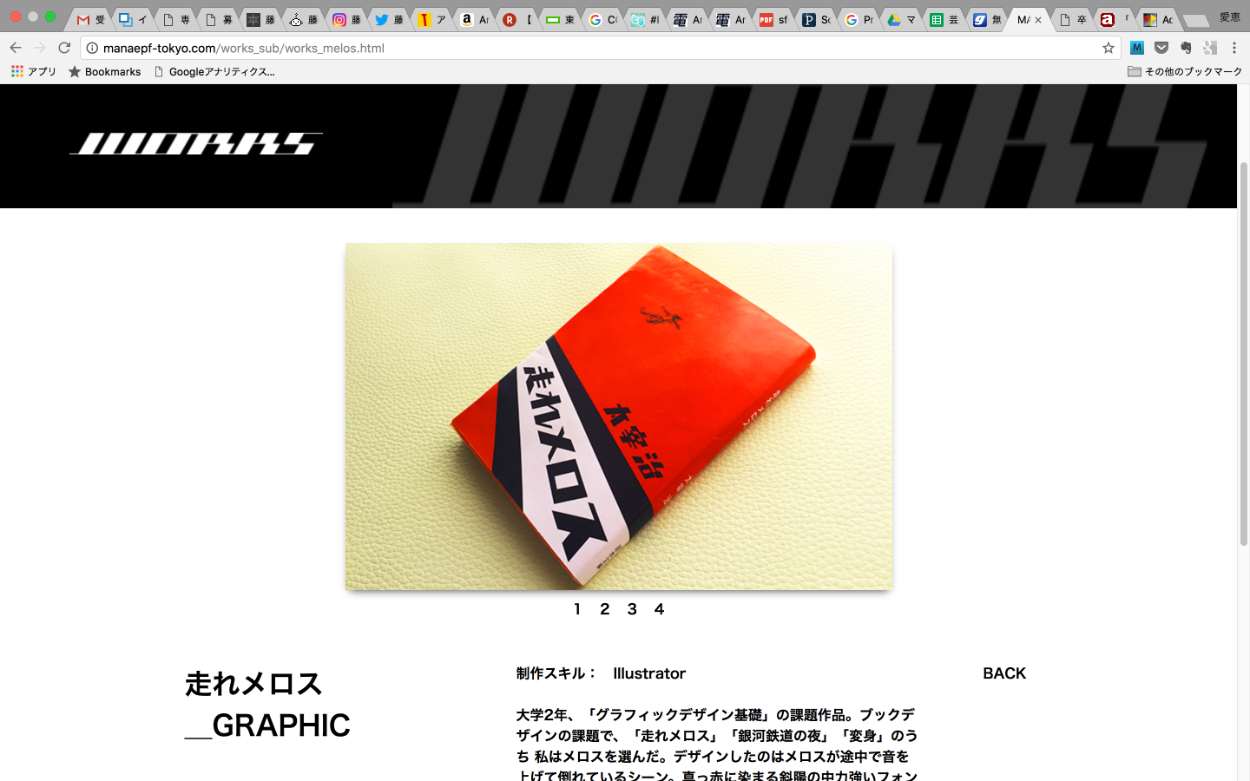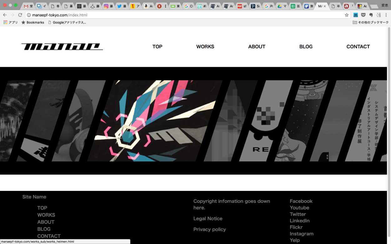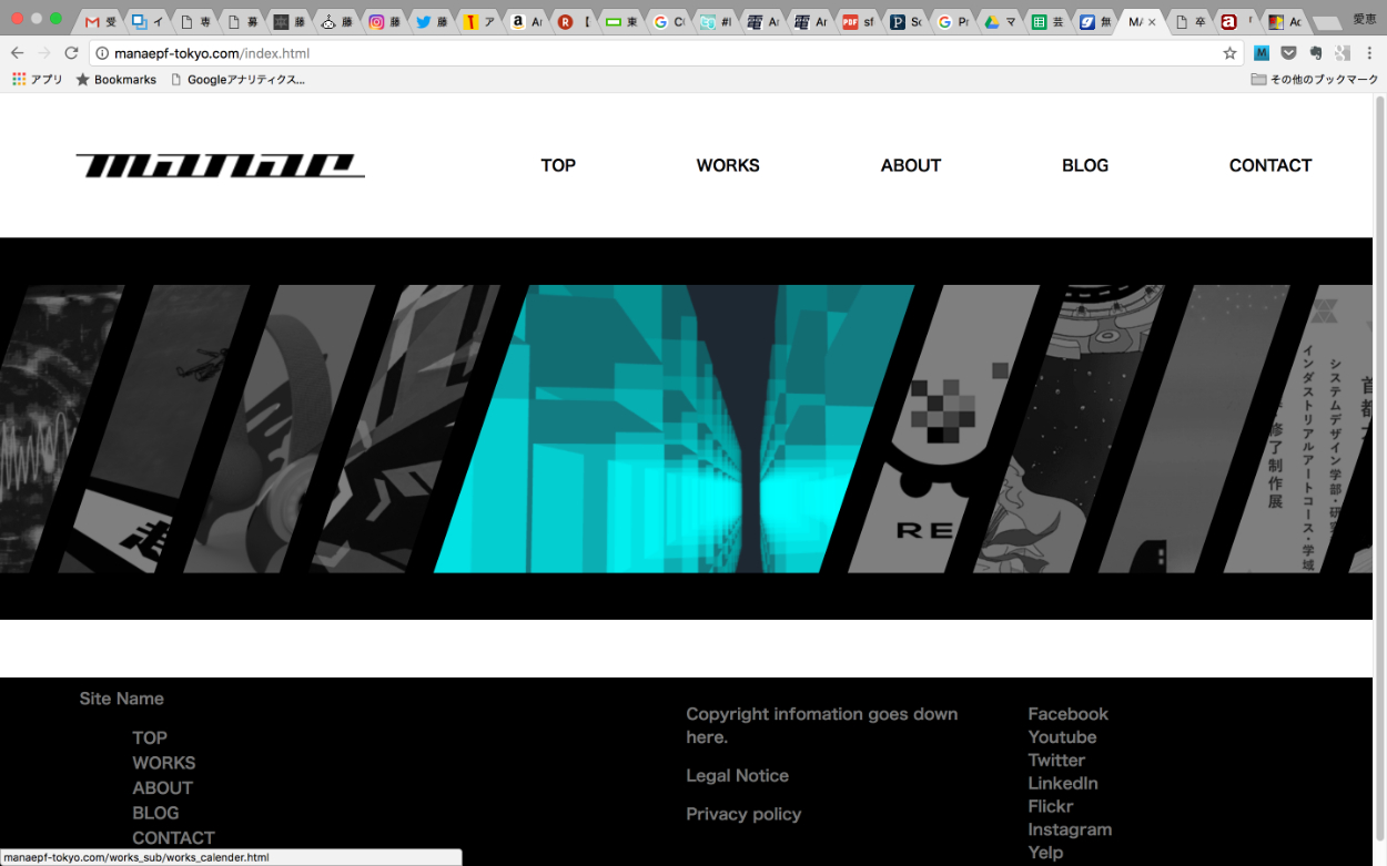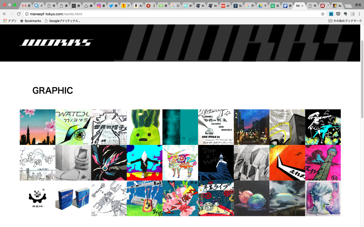 大学4年前期、そろそろ自分のポートフォリオサイトが作りたいと一念発起して制作。 現在は閉鎖中だが、右下の WEBSITE のページ先で http://manaepf-tokyo.com/ と記入、Search archived web sitesを選び検索すると一部閲覧可能。