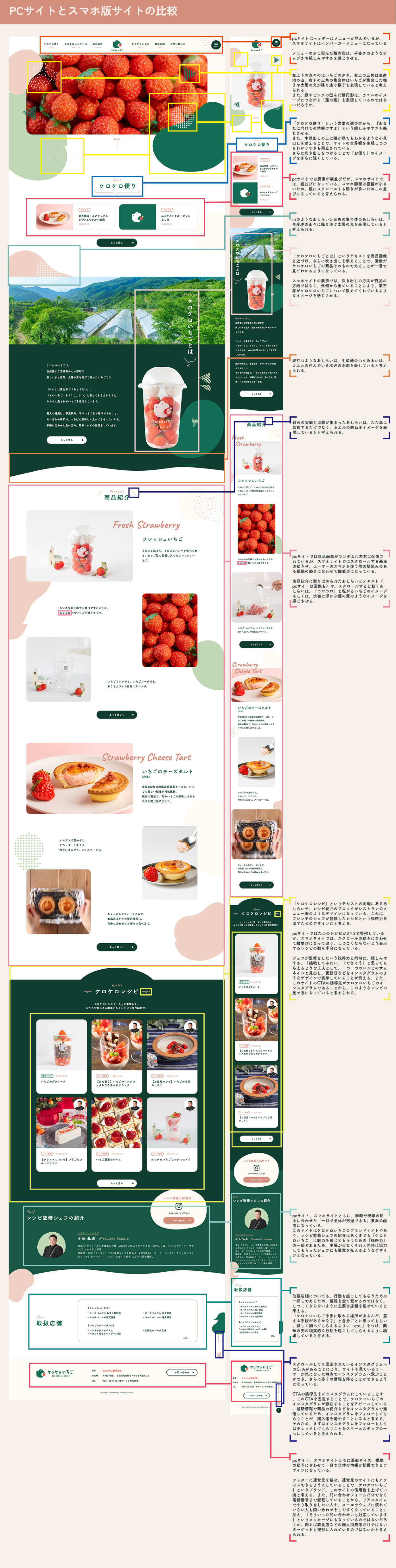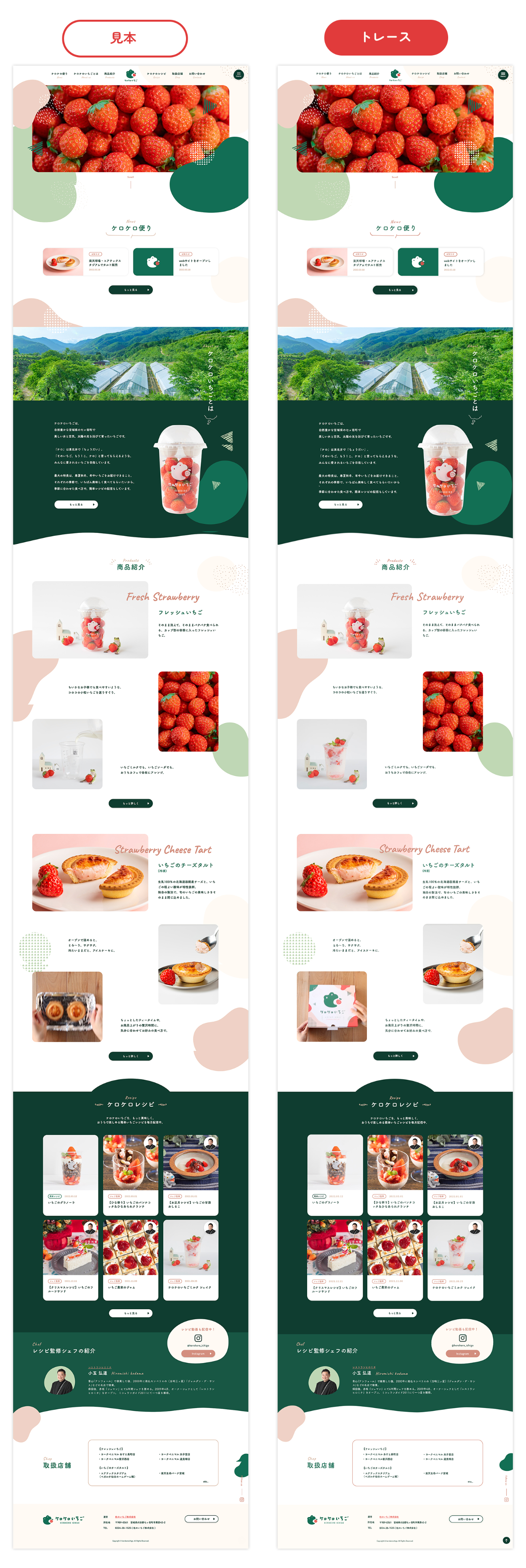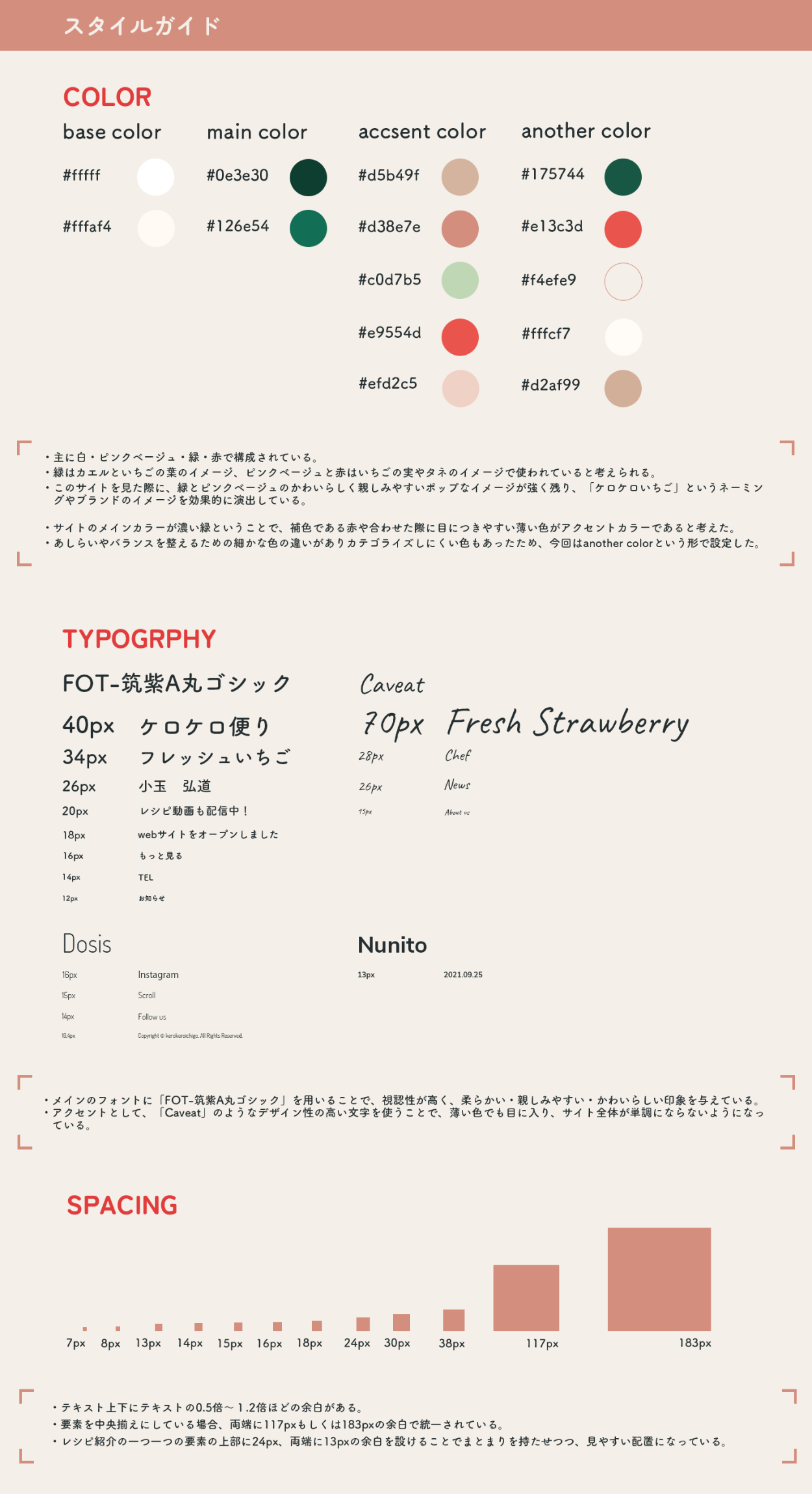 今回「ケロケロいちご」のサイトをトレースする際、制作者、デザイナーあるいは運営元がどうしてこのような配置、テキスト、ビジュアル、あしらいなどを用いたのかという「デザインの理由」をできるだけ多く考えました。一つ一つのデザインに根拠があり、その根拠の目的はサイトの目指すゴールに起因しているいうことを今後の制作でも忘れないようにしたいです。